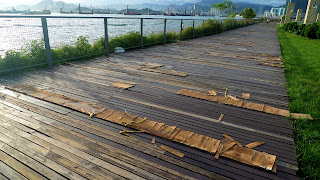 轉入西九海濱長廊,繞過早前進行「M+進行: 充氣!」展覽的草地,即可到達維港海濱。這裏沒有人山人海,沒有旅行團,沒有名店,沒有遊人的大聲叫嚷,只有充滿閒情享受維港美景的遊人。隔着鐵絲網,看見遠方停泊着一輛九巴熱狗,據說是西隧訓練巴士,喚起一點少時坐熱狗吹風的回憶。